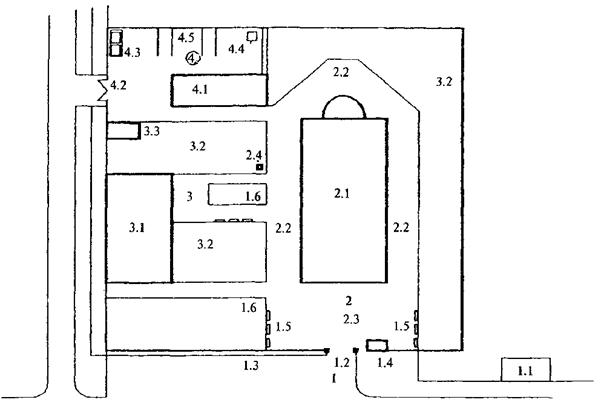 Движение священнослужителей по храму совершается в зависимости от вида богослужения. Схемы движения и остановок священнослужителей во время вечерни и Литургии приведены на рис. 4. Пути движения священнослужителей и места совершения ими богослужений вне алтаря должны учитываться при расчете площадей для размещения молящихся и вместимости храма.