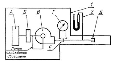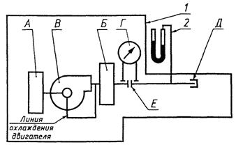 1 - испытуемая фильтровентиляционная автомобильная установка, включающая: А - предфильтр; Б - фильтр-поглотитель; В - электровентилятор; Г - дифференциальный манометр класса точности 4, удовлетворяющий требованиям ГОСТ 18140-84; Д - заглушка; Е - сужающее устройство с диафрагмой, удовлетворяющее требованиям нормативно-технической документации на фильтровентиляционную установку, утвержденной в установленном порядке; 2 - двухтрубный манометр