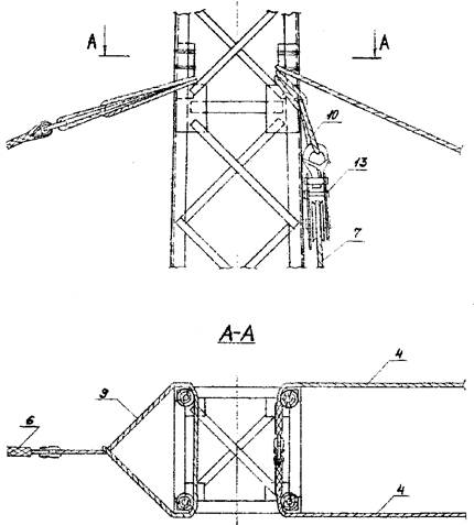в) смонтировать на оголовке стрелы тросы от стрелы к опоре (вожжи) и трос для опускания и подъёма стрелы на высоту;