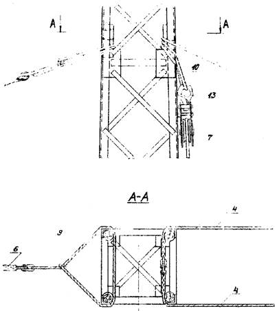 з) трос, предназначенный для опускания стрелы, пропустить через блок, закрепленный на опоре. Свободный конец этого троса привязать к основанию опоры;