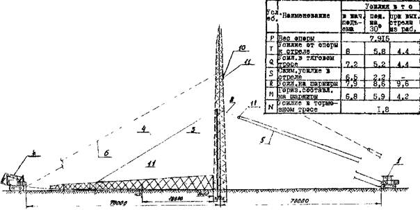 г) краном ТК-53 в положении 1 (см. схему подъема стрелы), поднять узел монтажной стрелы на высоту 10 м, указанную в карте;