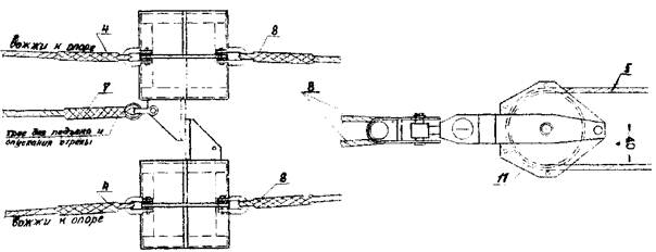 в) произвести застроповку тягового и тормозного тросов в местах, указанных на рис. 4, лист 17, для опоры П110-5 и рис. 10 лист 28, для опоры П110-6;