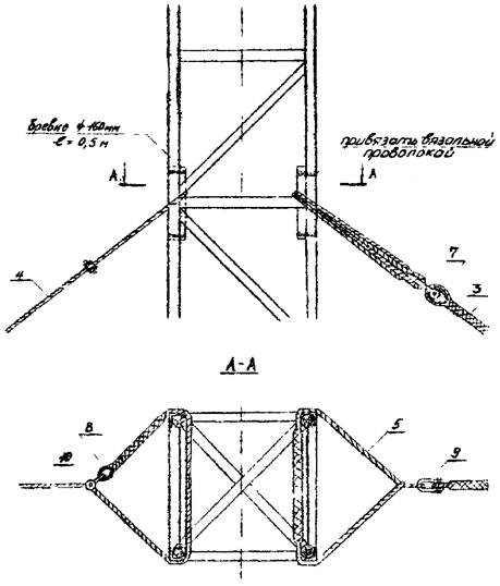 з) трос, предназначенный для опускания стрелы, пропустить через блок, закрепленный на опоре. Свободный конец этого троса привязать к основанию опоры;
