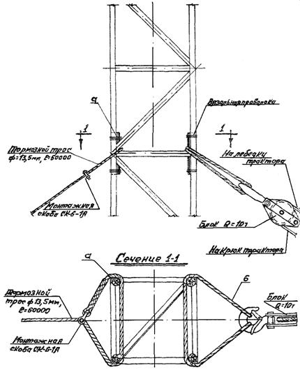 б) электролинейщик IV, III и два человека II разряда производят работы по сборке подъемной схемы, укрепление, если это требуется, распорками фундаментами (подножников) согласно рис. 1;