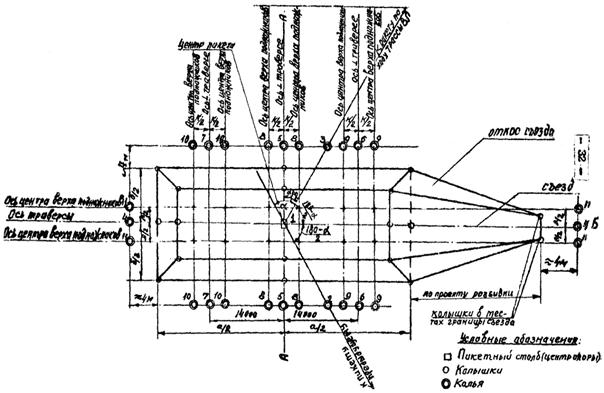 г) определяются границы верхнего контура котлована вдоль траверсы, для чего откладываются размеры: а/2 - половина расстояния между границами верхнего контура котлована вдоль траверсы Б-Б и б/2 - половина расстояния между границами верхнего контура котлована по оси А-А. В полученных точках забиваются колышки.