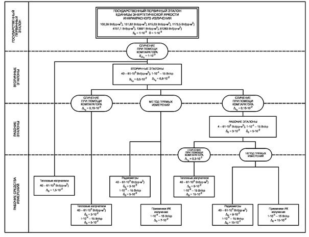Настоящий стандарт распространяется на государственную поверочную схему для средств измерений энергетической яркости и силы излучения тепловых источников с температурой от 220 до 1360 К и устанавливает порядок передачи размеров единиц энергетической яркости в диапазоне от 40 до 61 · 103 Вт/ (ср · м2) и силы излучения в диапазоне от 1 · 10-4 до 15 Вт/ср от государственного первичного эталона при помощи вторичных и рабочих эталонов рабочим средствам измерений с указанием погрешностей и основных методов поверки (приложение А).