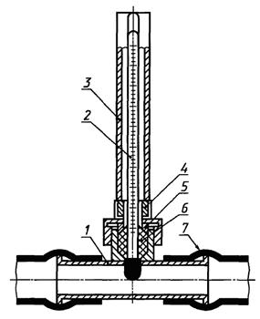 1 - тройник; 2 - термометр; 3 - кожух; 4 - гайка; 5 - кольцо; 6 - резиновое уплотнение; 7 - рукав