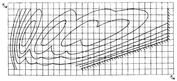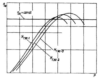 По результатам расчетов, проведенных для ряда значений напора, строятся рабочие характеристики гидроагрегата hа = f(Р) (рис. 3). Проводя горизонтальные линии, соответствующие целым значениям КПД, по точкам пересечения их с рабочими характеристиками определяют координаты изолиний КПД и наносят их в поле координат НГЭС - Р. Точки, соответствующие равным значениям КПД, соединяют плавными линиями. Координаты изолиний расходов определяют из вышеприведенной таблицы.