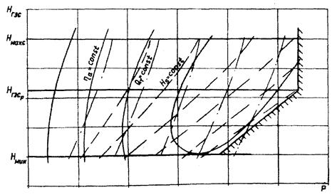 2.1. Эксплуатационная характеристика гидроагрегата представляет собой совокупность изолиний, определяющих зависимость КПД и расхода гидротурбины от напора ГЭС и мощности гидроагрегата при допустимой высоте отсасывания.