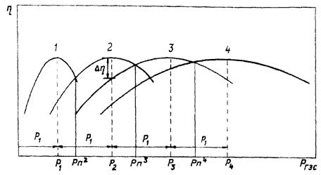 Например, при мощности ГЭС Р2 оптимальное число гидроагрегатов равно двум (см. рис. 7). Если в качестве вращающегося резерва будет включен третий гидроагрегат, то КПД ГЭС снизится на величину Dh. Поскольку вращающийся резерв в течение года может задаваться различным и при различной нагрузке ГЭС, то за Dh следует принимать некоторое среднестатистическое значение. Оно может быть определено только путем статистической обработки данных по нагрузкам и числу гидроагрегатов.