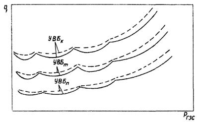 Следовательно, повышение удельного расхода (Dq) при исходном уровне верхнего бьефа можно найти линейной интерполяцией между двумя нормативными характеристиками удельных расходов ГЭС (см. рис. 9).