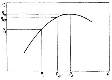 5.7. Привлечение ГЭС к системному регулированию может вызывать ухудшение экономичности ее работы вследствие периодических изменений нагрузки, из-за чего часть времени гидроагрегаты работают при пониженных значениях КПД. Колебания носят нерегулярный характер, не подчиняются какому-либо определенному закону. Поэтому приближенно можно считать, что при средней нагрузке Рср, средневзвешенное значение КПД при изменении нагрузки от P1 до Р2 (рис. 10) равно среднеарифметическому значению КПД для этих значений нагрузок, т.е.