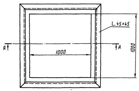 2.1.5. Измерительная рамка изготовляется из листового железа толщиной 5 мм (рис. 1). С наружной стороны к верхнему краю рамки приварен по всему периметру железный уголок 45´45 мм. Ко всем углам рамки вдоль их наружной стороны привариваются уголки 45´45 мм, связанные также сваркой с верхним поясом из уголков.