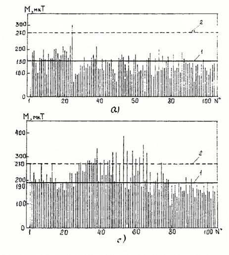 6.3.9 Строится график в координатах: номер трубы № - магнитный параметр М с использованием результатов измерений, взятых по абсолютной величине. На графике проводятся две горизонтальные линии, определяющие среднее Н (нижняя сплошная) и граничное В (верхняя пунктирная) значения магнитного параметра. График косвенно через магнитный параметр металла, зависящий от температуры эксплуатации, отражает тепловую неравномерность труб. Среднее и граничное значения предназначены соответственно для выявления тепловой неравномерности поверхности нагрева в целом и перегретых труб, относящихся к группе риска.