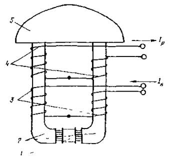 1 - феррозондовый преобразователь; 2 - магнитопроводы; 3 - обмотки намагничивания; 4 - обмотки размагничивания; 5 - участок контролируемого изделия