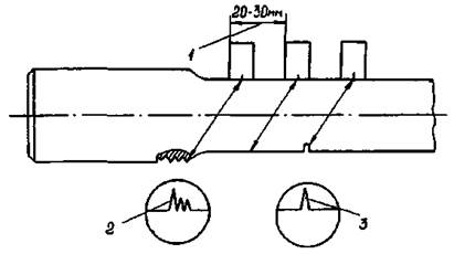1, 2 - положения ПЭП при контроле галтельного перехода; 3 - положение ПЭП при контроле резьбовой части