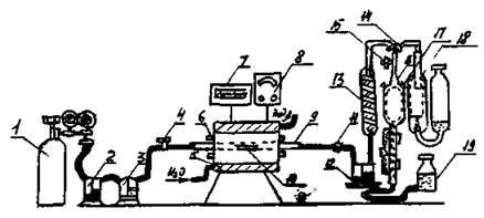Установка для газообъемного определения углерода состоит из следующих элементов (рисунок 1): баллона с кислородом или кислородопровода, снабженного редукционными вентилями для пуска и регулирования тока кислорода 1; промывной склянки Тищенко, наполненной раствором марганцовокислого калия с массовой концентрацией 40 г/дм3 в растворе гидроксида калия (натрия) с массовой концентрацией 400 г/дм3 2; промывной склянки, наполненной концентрированной серной кислотой для поглощения паров воды 3; стеклянного крана, с помощью которого регулируют скорость тока кислорода 4; трубчатой горизонтальной печи с силитовыми нагревателями 5; металлического кожуха, в который заключена печь 6; терморегулятора типа ПСР или другого подобного типа 7; регулятора напряжения типа РНО-250-10 или другого подобного типа 8; фарфоровой или огнеупорной муллитокремнеземистой трубки длиной 750 мм внутренним диаметром 18 - 22 мм, концы которой должны выступать из печи не менее, чем на 160 мм с каждой стороны 9; лодочки фарфоровой 10; стеклянной трубки с расширением, заполненной ватой для удержания твердых оксидов, уносимых из печи током кислорода 11; промывной склянки с раствором двухромовокислого калия в серной кислоте 12; газоанализатора ГОУ-1 или КГА-4, включающего змеевиковый холодильник для охлаждения поступающей из печи газовой смеси (диоксида углерода и кислорода) 13; двухходового крана, через который газовая смесь поступает в эвдиометр (газоизмерительную бюретку) 14; одноходового крана, соединяющего эвдиометр с атмосферой 15; эвдиометра, к узкой части которого прикреплена градуированная на процентное содержание углерода подвижная шкала 16; термометра, для измерения температуры газов 17; сосуда для поглощения диоксида углерода, наполненного раствором гидроксида калия (натрия) 18; уравнительной склянки, наполненной затворной жидкостью 19.