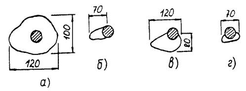 2.1.4. В процессе налипания мокрого снега по мере увеличения эксцентриситета отложения и роста толщины его стенки происходит проскальзывание снежного осадка вдоль наружного повива в нижнюю часть провода (рис. 1), а также закручивание провода при более прочном сцеплении с ним эксцентричного одностороннего отложения. На боковой поверхности провода со стороны несущего снег воздушного потока продолжается процесс налипания [1]. В зависимости от крутильной жесткости провода и влагосодержания снега (определяющей способность снега скользить вдоль повива провода) образуются отложения с формой, близкой к цилиндрической (рис. 2, а), либо с разной степенью эксцентричности (рис. 2, б, в, г). Обычно толщина стенки отложения находится в пределах от 40 до 140 мм. Известны случаи, когда толщина налипающего снега достигает 160 - 200 мм.
