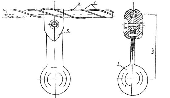 1 - груз с тягой; 2 - плашечный зажим; 5 - провод; 4 - армирующие прутки