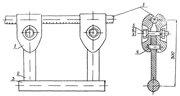 1 - плашка; 2 - тяга; 3 - груз; 4 - палец; 5, 6, 7 - болт, гайка, шайба; 8 - провод