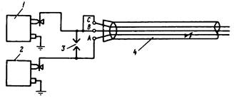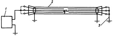 После выполнения всех мер безопасности при работах на кабельных линиях (см. приложение) приступают к определению вида повреждения. С помощью омметра и мегаомметра на разземленном кабеле производят измерение сопротивления изоляции между жилами; каждой жилой и оболочкой кабеля. Данными приборами выявляются однофазные и междуфазные повреждения с сопротивлением в месте дефекта от нуля до сотен килоом. При большом сопротивлении часто не удается определить вид повреждения указанными приборами, тогда используют высоковольтную испытательную установку. Поочередно, испытывая все три жилы кабельной линии выпрямленным напряжением постоянного тока относительно оболочки кабеля, выявляют вид дефекта кабеля.