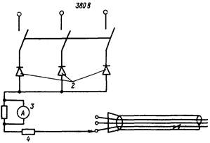 Если через поврежденную жилу кабеля длительно протекал ток однофазного короткого замыкания на оболочку, то в месте повреждения возможно сваривание токоведущей жилы с экранирующей оболочкой. Разрушить место сварки прожиганием часто не удается, без чего не всегда можно определить место повреждения на трассе кабельной линии. Для разрушения места сварки нужно собрать схему посылки высоковольтной волны от заряженного конденсатора (рис. 2). Емкость конденсатора выбирается максимальной и при этом можно подключить к установке емкость неповрежденных жил кабеля. При посылке высоковольтной волны от заряженного конденсатора за счет ударных динамических усилий при импульсном разряде происходит разрушение проводящего мостика. Однако часто место сварки оказывается достаточно прочным и этот метод так же не дает результата. В этом случае для разрушения металлического спая можно использовать схему, показанную на рис. 3. Выпрямительную установку трехфазного тока подключают к поврежденной жиле кабеля на несколько секунд, в течение которых через место повреждения протекает большой ток (до 400 А), разогревающий спай в месте повреждения и разрушающий его. Но даже с помощью выпрямительной установки не всегда можно разрушить металлический спай в месте повреждения, особенно на кабелях ААБ.