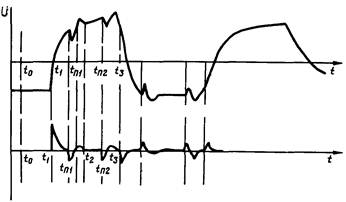 С помощью высоковольтной испытательной установки на поврежденной жиле кабеля поднимается напряжение до пробоя. Короткое замыкание в заряженной жиле кабеля приводит к появлению электромагнитных волн, которые распространяются от места пробоя в месте дефекта к началу и к концу кабельной линии. Эпюры напряжения колебательного процесса при пробое заряженной кабельной линии, снятые на зажимах кабеля, и эпюры напряжений после дифференцирования колебательного процесса входными цепями измерителя показаны на рис. 7.