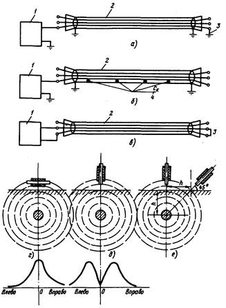 Генератор постоянного, переменного или импульсного тока включается между экранирующей оболочкой и цепями заземления, и оператор должен начинать измерения с точки трассы, заведомо находящейся до места повреждения. С помощью зондов (контактные стержни при использовании генератора постоянного тока, контактные пластины при включении генератора переменного или импульсного тока), разнесенных между собой на расстоянии от 50 до 100 см, оператор производит измерение (гальванометром на постоянном токе, милливольтметром на переменном токе и импульсным вольтметром при импульсном токе) разности потенциалов на поверхности земли, перемещаясь вдоль трассы кабельной линии. До места повреждения стрелки измерительных приборов будут отклоняться в одну сторону, за местом повреждения в другую сторону, а непосредственно в месте повреждения отклонения стрелки от среднего положения не будет. Прибор для определения места повреждения в изолирующей пластмассовой наружной оболочке кабеля разработан во ВНИИЭ.