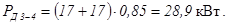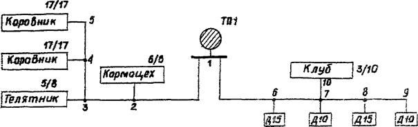 Расчетные нагрузки на участках сети определяется согласно п. 3.1. Расчет ведется с конца линии, например, с участка 3 - 4. По данному участку питаются два коровника (шифр нагрузки - 109), присоединенные в точках 4 и 5. Суммарная активная дневная нагрузка на участке 3 - 4 составит