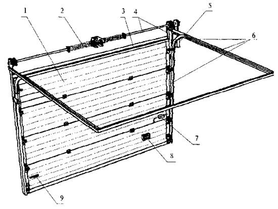 1 - полотно ворот; 2 - система уравновешивания полотна; 3 - уплотнитель; 4 - элементы обрамления проема; 5 - привод; 6 - направляющие профили; 7 - задвижка; 8 - ручка; 9 - запирающее устройство