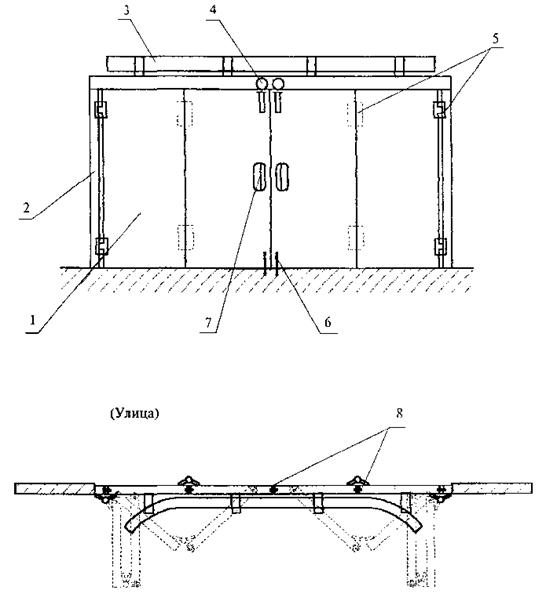 1 - щитовое полотно; 2 - элементы обрамления проема; 3 - ручка; 4 - запирающее устройство; 5 - нижняя опорная балка; 6 - привод; 7 - силовая (несущая) рама; 8 - роликовые опоры