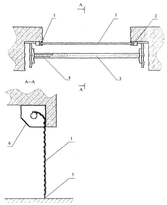 1 - полотно ворот; 2 - направляющий профиль; 3 - устройство намотки полотна; 4 - привод; 5 - уплотнитель; 6 - защитный короб