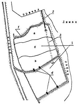I - карты намыва (а - пляжная зона; б - промежуточная; в - прудковая); 1 - дамбы обвалования; 2 - пульпопровод первой очереди; 3 - пульпопровод второй очереди; 4 - водосбросные колодцы