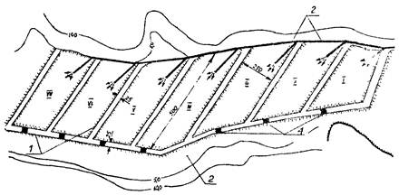 I - VII - карты намыва; 1 - дамбы обвалования; 2 - водоотвод; 3 - пульпопровод; 4 - водосбросные колодцы