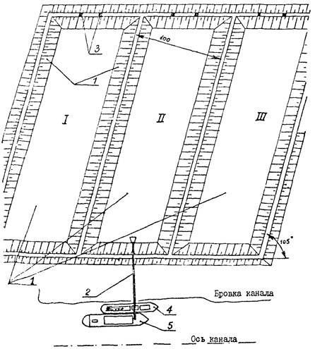 I - III - карты намыва; 1 - дамбы обвалования; 2 - пульпопровод; 3 - водосбросы; 4 - станция регулирования; 5 - самоотвозный землесос