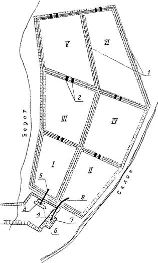 I - VI - карты намыва; 1 - дамбы обвалования; 2 - водосбросы; 3 - плавучий причал; 4 - самоотвозный землесос; 5 - береговой пульпопровод; 6 - депозит; 7 - шаландоперегружатель; 8 - плавучий пульпопровод