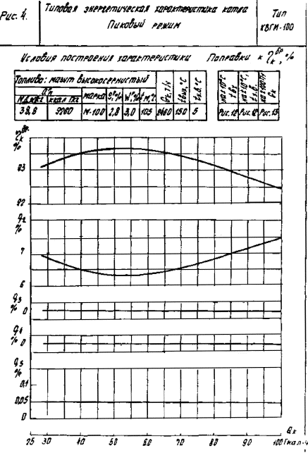 2.2.8. Типовая энергетическая характеристика и приложения к ней котла КВГМ-100 при работе в основном и пиковом режимах даны в виде диаграмм (рис. 1 - 7) и цифровых значений (табл. 1 и 4).