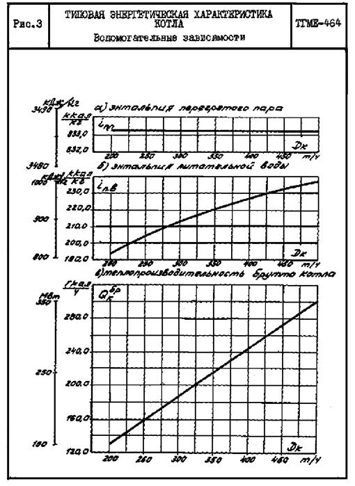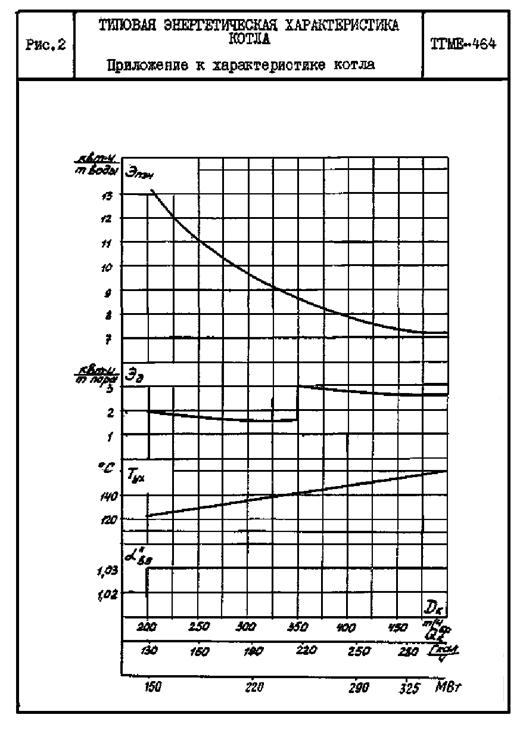 2.1. Типовая энергетическая характеристика (рис. 1, 2, 3) составлена на основании результатов тепловых испытаний котлов ТГМЕ-464 (№ 1, 2) Северодвинской ТЭЦ-2 с использованием директивных материалов и методических указаний по нормированию технико-экономических показателей котлов. Характеристика отражает среднюю экономичность котла, работающего с турбиной T-100/120-130/3 при нижеприведенных условиях, принятых за исходные.