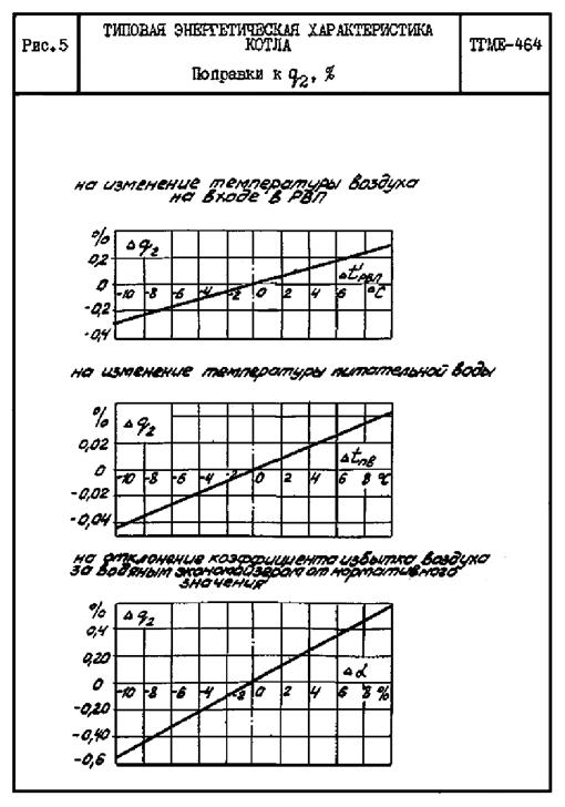 3.1. Для приведения основных нормативных показателей работы котла к измененным условиям его эксплуатации в допустимых пределах отклонения значений параметров даны поправки в виде графиков и цифровых значений. Поправки к q2 в виде графиков приведены на рис. 4, 5. Поправки к температуре уходящих газов приведены на рис. 6. Кроме перечисленных, приведены поправки на изменение температуры подогрева мазута, подаваемого в котел, и на изменение температуры питательной воды.