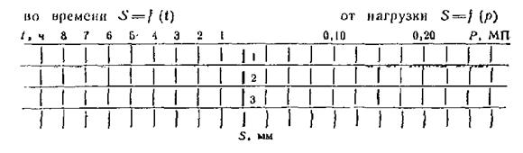 В процессе испытания в соответствующих графах журнала записывают задаваемые ступени давления на грунт и данные показаний прогибомеров, фиксирующих осадку грунта при заданных нагрузках до ее условной стабилизации.