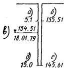 а - глубина подошвы слоя; б - абсолютная отметка подошвы слоя; в - абсолютная отметка установившегося уровня подземных вод и дата замера; д - глубина забоя; е - абсолютная отметка забоя