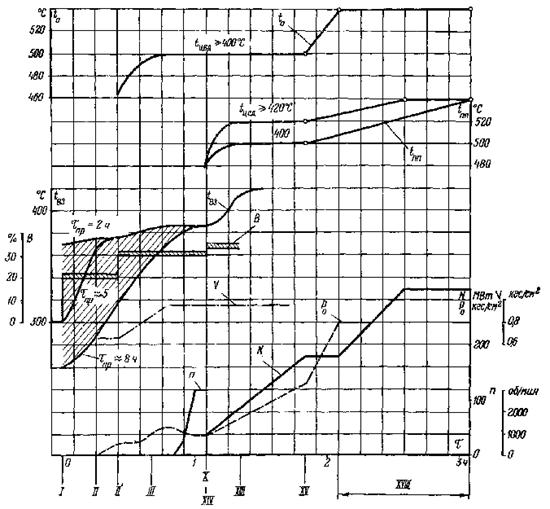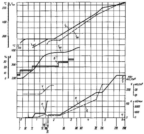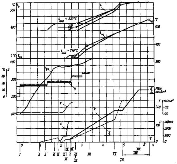 ХII - включение пусковых впрысков в паропроводы горячего промперегрева, начало отключения байпасов промежуточного пароперегревателя;