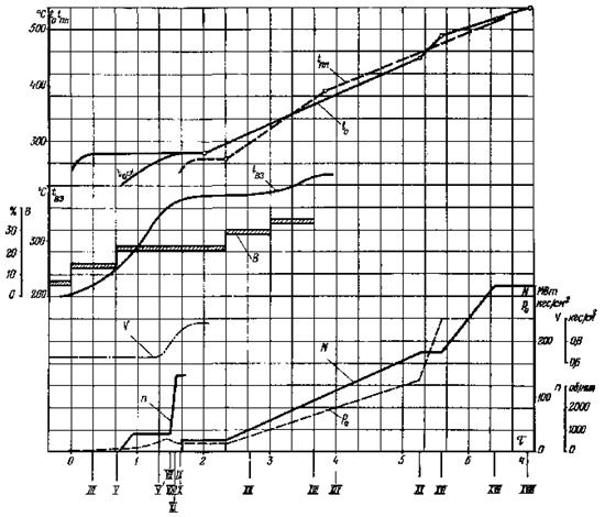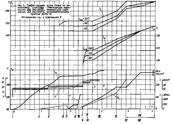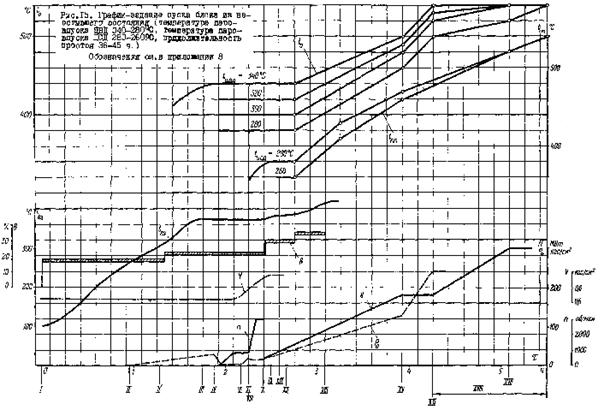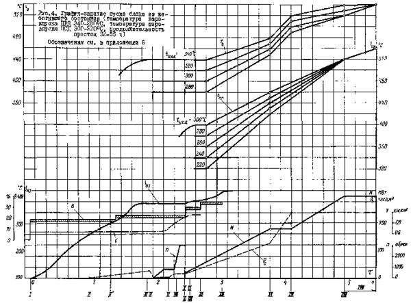 Рис. 17. График-задание пуска блока из неостывшего состояния (температура паровпуска ЦВД 360 - 300 °С, температура паровпуска ЦСД 310 °С, продолжительность простоя 26 - 34 ч)