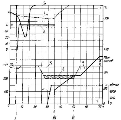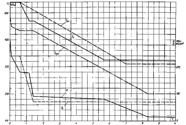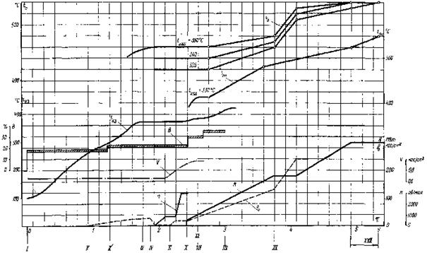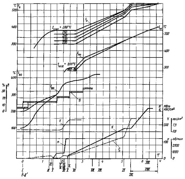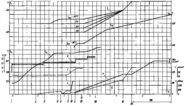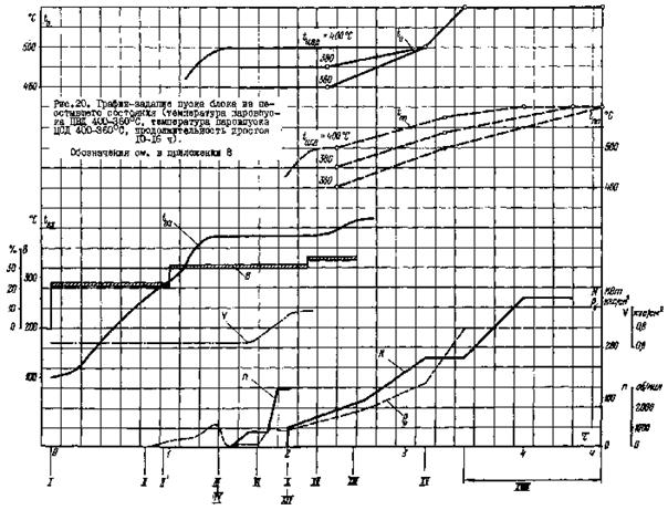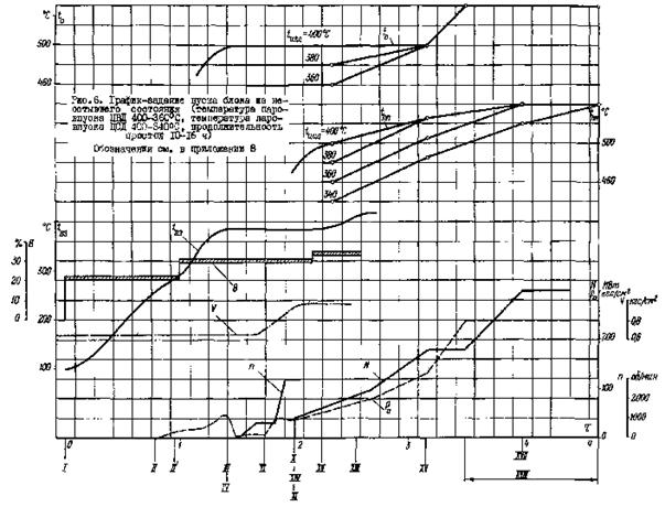 Рис. 20. График-задание пуска блока из неостывшего состояния (температура паровпуска ЦВД 400 - 360 °С, температура паровпуска ЦСД 400 - 360 °С, продолжительность простоя 10 - 16 ч)