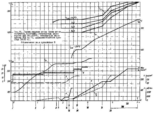 Рис. 16. График-задание пуска блока из неостывшего состояния (температура паровпуска ЦВД 360 - 300 °С, температура паровпуска ЦСД 300 °С, продолжительность простоя 28 - 36 ч)