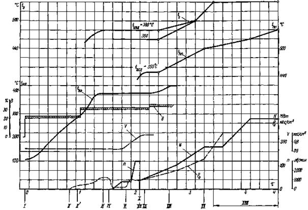 Рис. 19. График-задание пуска блока из неостывшего состояния (температура паровпуска ЦВД 380 - 360 °С, температура паровпуска ЦСД 350 °С, продолжительность простоя 18 - 26 ч)
