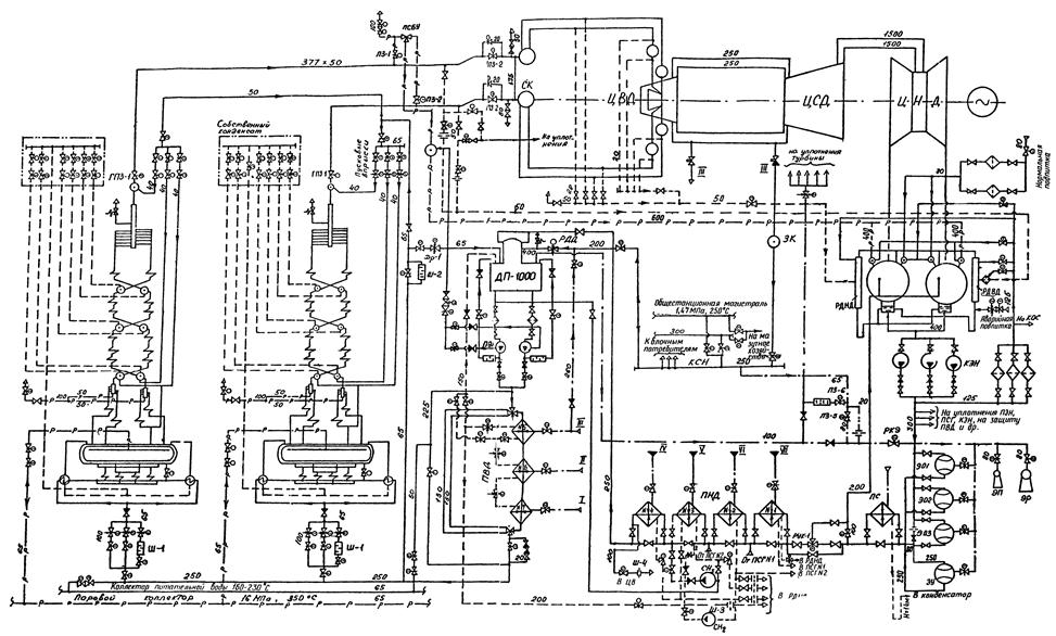 1.2. В основу пусковой схемы положены типовые решения, применяемые для конденсационных энергоблоков с барабанными комами мощностью 160 и 210 МВт. Ряд узлов пусковой схемы усовершенствован с учетом результатов испытаний и разработок предприятий «Уралтехэнерго», «Сибтехэнерго», ПО «Союзтехэнерго», УПИ им. С.М. Кирова и ВНИПИэнергопрома, использованных при проектировании и внедрении блочных схем на электростанциях с поперечными связями.