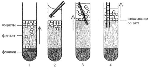 1 - флотация, 2 - наслаивание дистиллированной воды, 3 - размешивание, 4 - отсасывание ооцист.