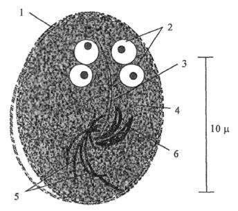 1 - наружная оболочка, 2 - ядра, 3 - аксостиль, 4 - цитоплазма, 5 - жгутиковый аппарат, 6 - медиальные тела.