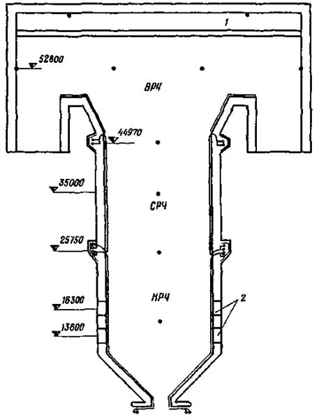4.1. Контроль за режимом сушки бетонных обмуровок осуществляется с помощью термопар, закладываемых в обмуровочные плиты до установки последних на котел. На головных котлах термопары устанавливаются из расчета: одна термопара на 10 м погонной длины обмуровки по высоте и ширине топки. Примерная схема расположения термопар дана на рис. 4.